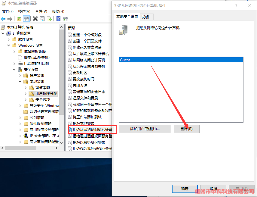 (1)、計算機(jī)配置->Windows設(shè)置->安全設(shè)置->本地策略->用戶權(quán)限分配->拒絕從網(wǎng)絡(luò)訪問這臺計算機(jī)->刪除Guest