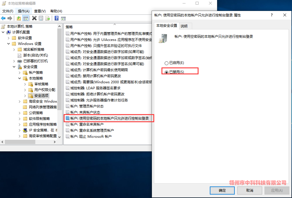 (2)、計算機(jī)配置->Windows設(shè)置->安全設(shè)置->本地策略->安全選項->帳戶:使用空密碼的本地帳戶只允許進(jìn)行控制臺登錄->已禁用