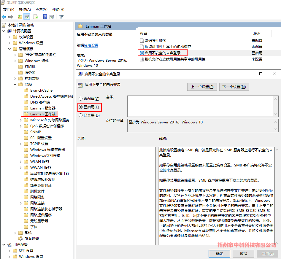 (3)計算機(jī)配置->管理模板->網(wǎng)絡(luò)->Lanman工作站->啟用不安全的來賓登陸->已啟用